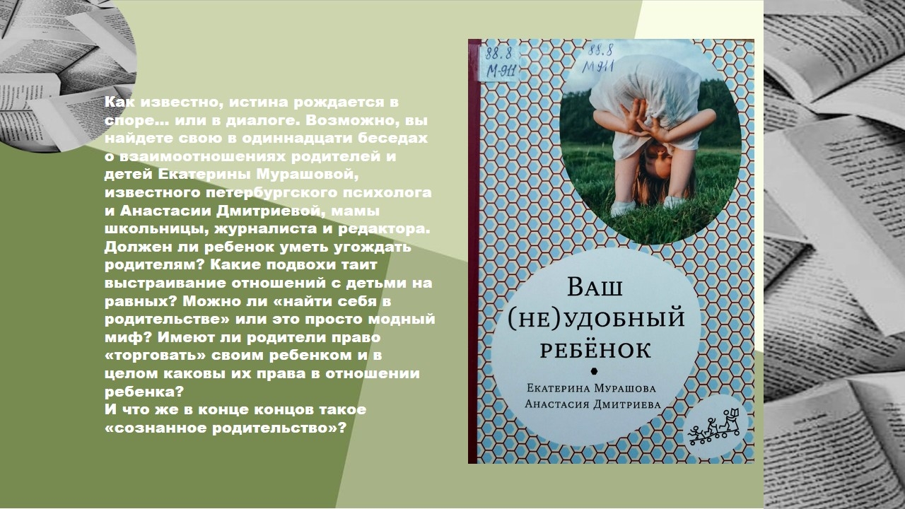 Мурашова, Е. Ваш (не)удобный ребенок / Екатерина Мурашова, Анастасия Дмитриева. – Москва : Самокат, 2022. – 176 с. – (Самокат для родителей). – ISBN 978-5-00167-093-3. – Текст : непосредственный.