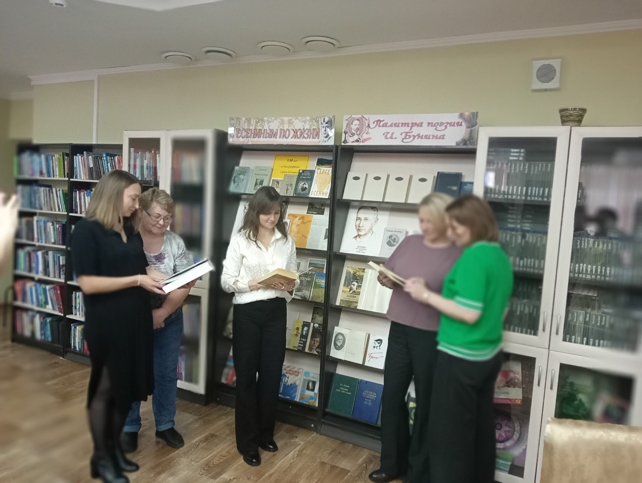 На этот раз гостей привлекла юбилейная выставка «Палитра поэзии И. А. Бунина», посвященная 155-летию со дня рождения писателя, в отделе гуманитарной литературы.