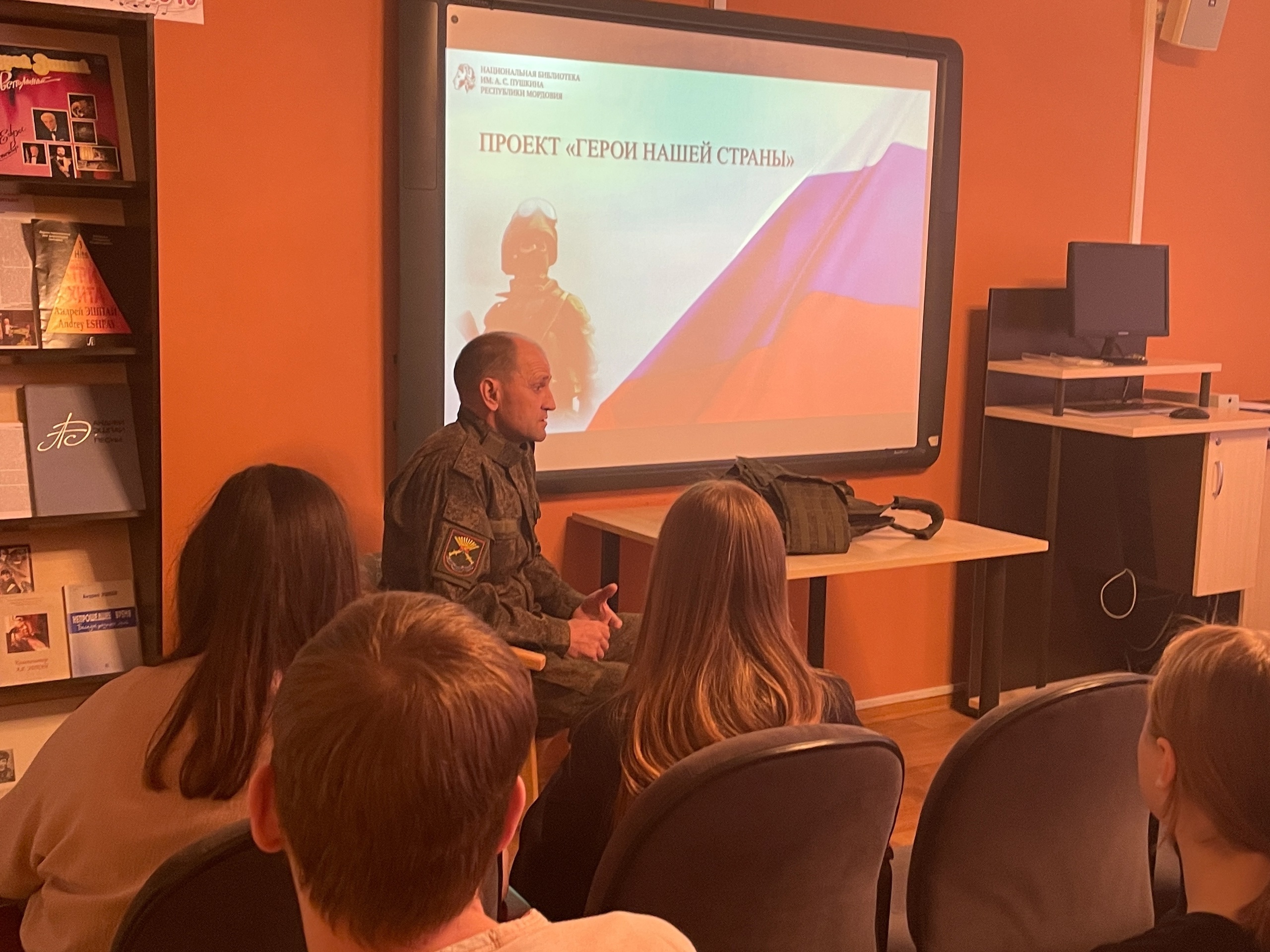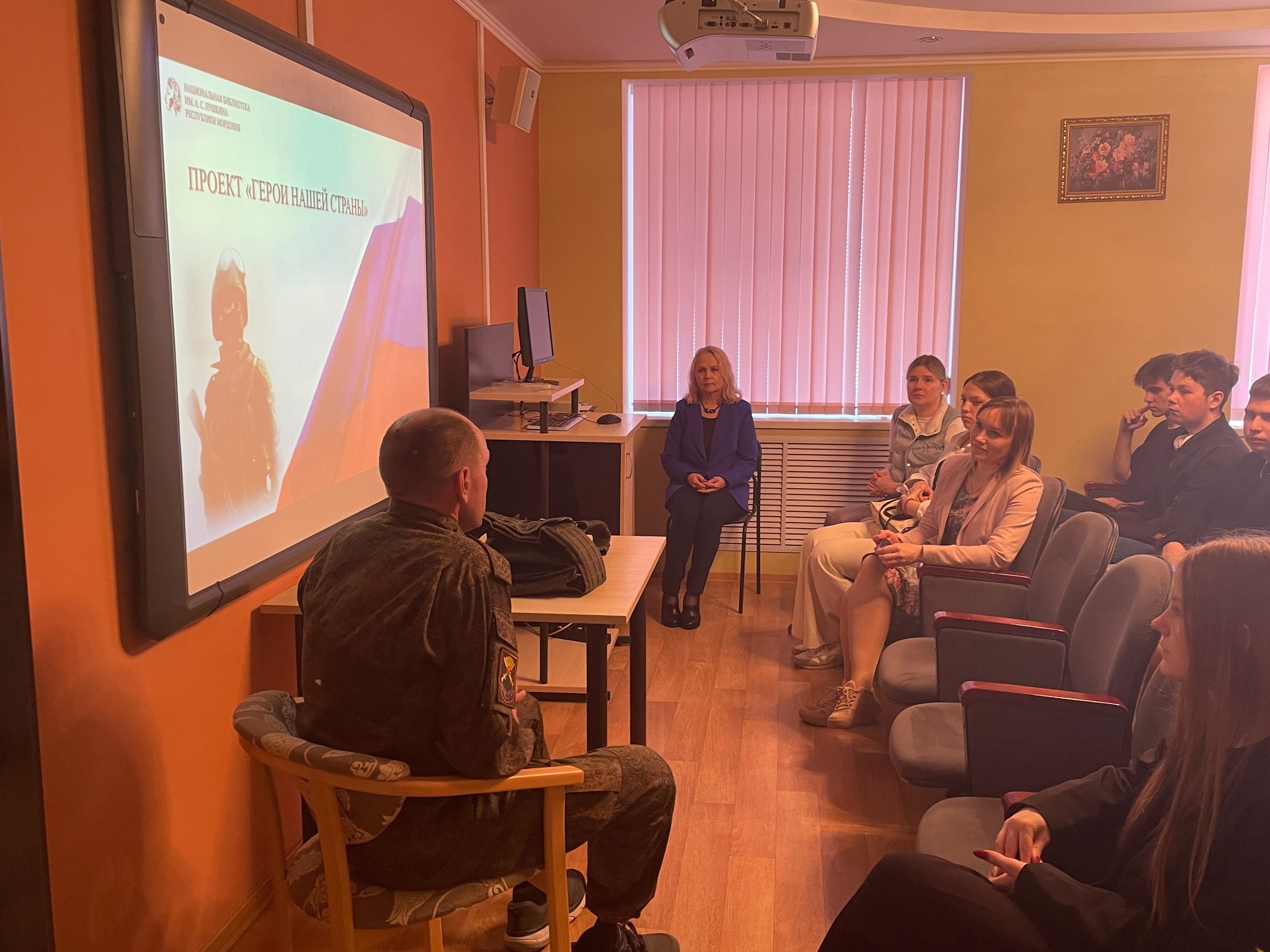 22 мая сотрудники отдела литературы на иностранных языках совместно с представителем фонда «Защитники Отечества» провели для студентов Саранского электромеханического колледжа и учащихся школы № 24 очередную встречу с ветераном специальной военной операции – Виктором Михайловичем Суглиным, который поделился историями из своей жизни и рассказал о боевых буднях российских солдат.