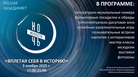 Наше мероприятие будет носить название «Вплетая себя в историю». Мы предложим гостям библиотеки стать частью общего яркого узора, сплетенного из наших эмоций, чувств и впечатлений. А впечатления гарантируем! Вечером 3 ноября вас ждет интересная и насыщенная программа, в которой найдется место музыке, творчеству, патриотизму, вдохновению, истории, развлечениям, национальным традициям, экскурсиям, выставкам, встречам с интересными людьми и даже чаепитию.