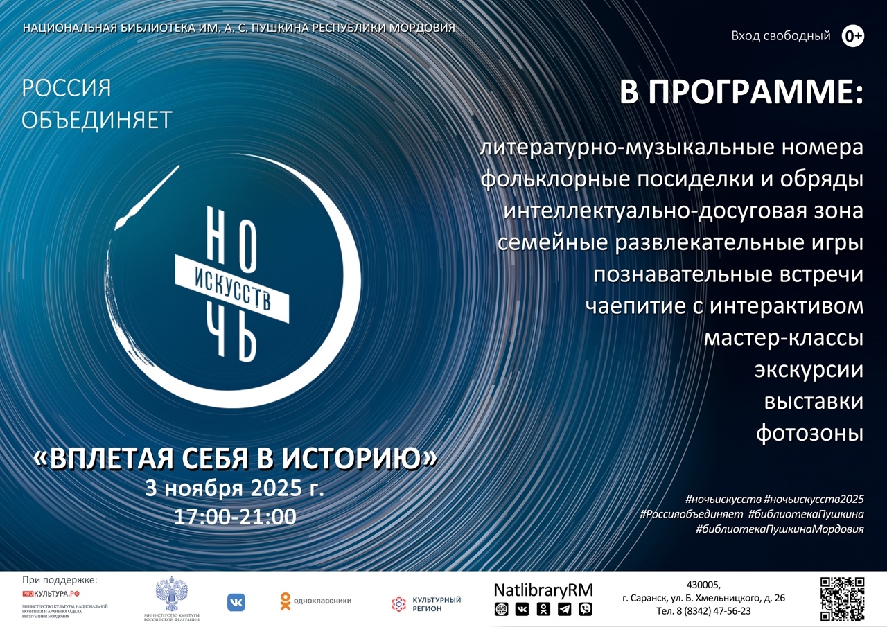 3 ноября с 17:00 до 21:00 Национальная библиотека Мордовии присоединится к традиционной ежегодной акции «Ночь искусств». В этом году её мероприятия будут приурочены ко Дню народного единства и пройдут под девизом «В единстве культур – сила народа».