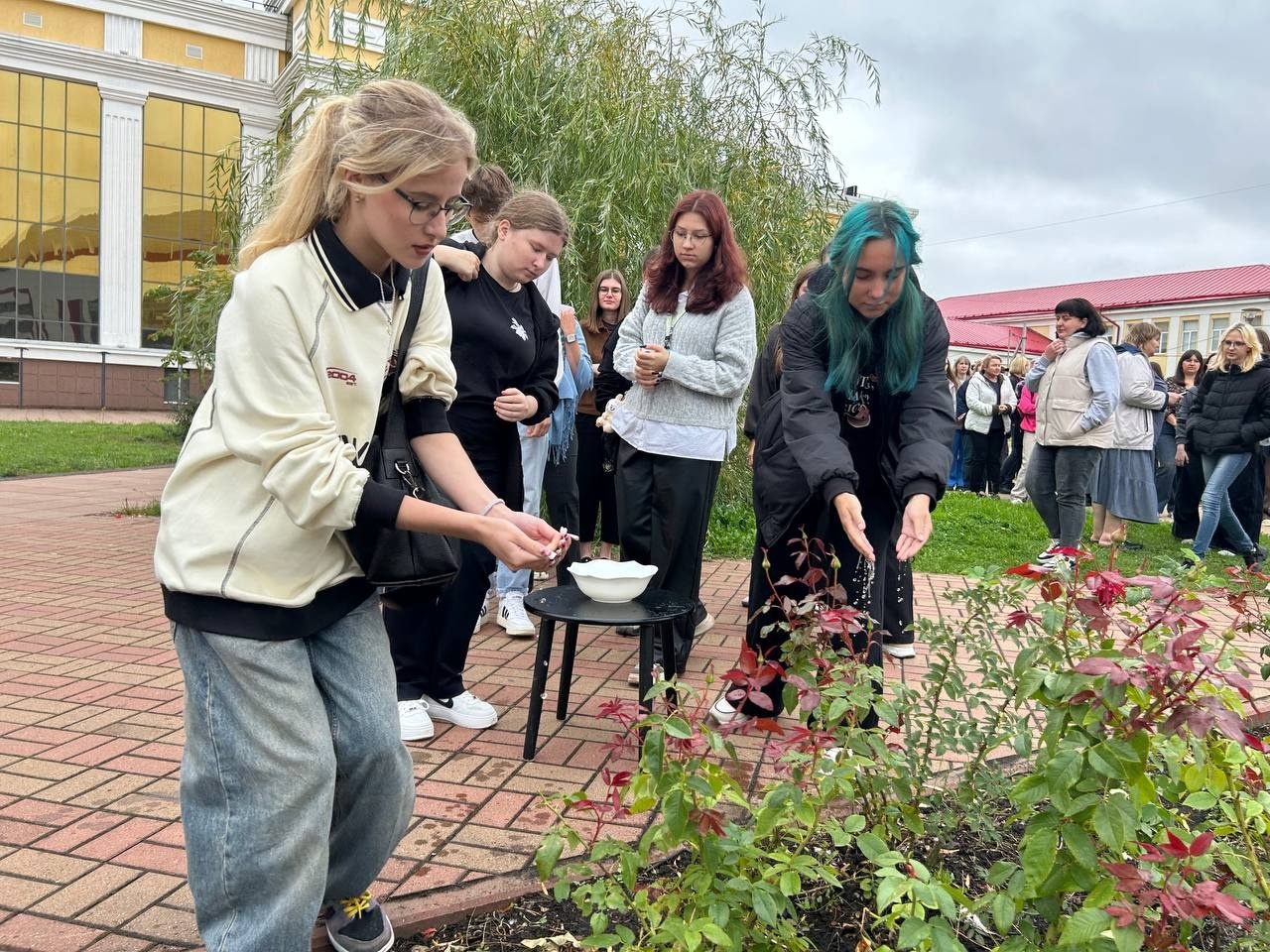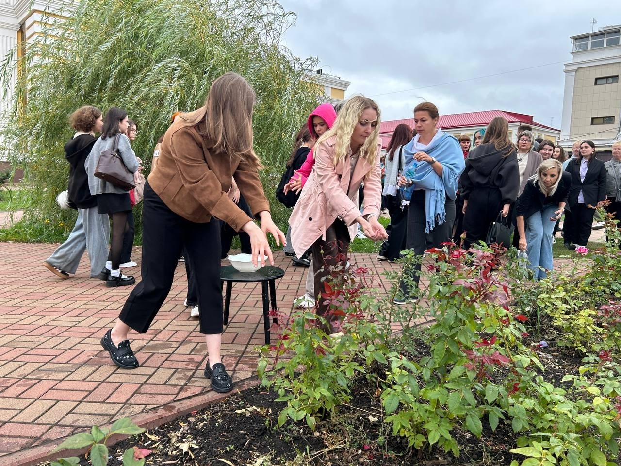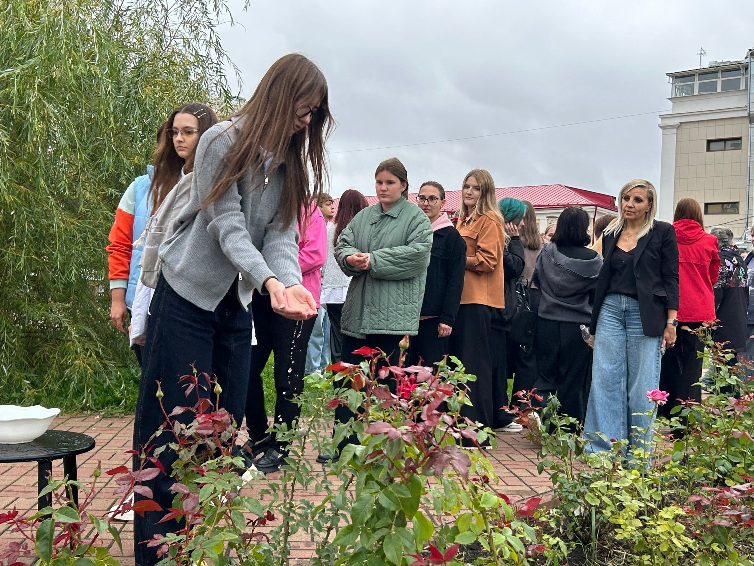 Участники акции набирают воду из чаши в сложенные лодочкой ладони и поливают растения из рук. Этот жест символизирует нашу общую скорбь и сострадание к жертвам террористических актов, а также нашу решимость противостоять этой угрозе. Вода, как символ жизни, становится знаком памяти о тех, чью жизнь отнял терроризм.