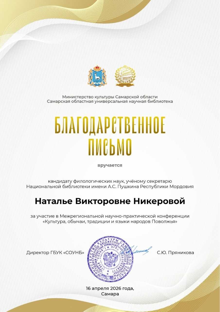 Сотрудники Пушкинки приняли активное участие в работе конференции. Н. В. Никерова, ученый секретарь Национальной библиотеки им. А. С. Пушкина Республики Мордовия, кандидат филологических наук, представила доклад «Электронная библиотека Республики Мордовия как глобальный ресурс сохранения и трансляции культуры мордовского народа», в котором подробно рассказала о потенциале цифровых технологий в сфере сохранения и систематизации этнокультурного наследия мордвы. С. А. Маскаева, библиотекарь отдела национальной и краеведческой литературы, выступила с докладом «Академическая серия “Устное народное творчество мордовского народа”» как одна из жемчужин фонда НБ им. А. С. Пушкина», осветив ценность и уникальность данного многотомного сборника, представляющего собой значительный пласт нематериального культурного наследия республики.