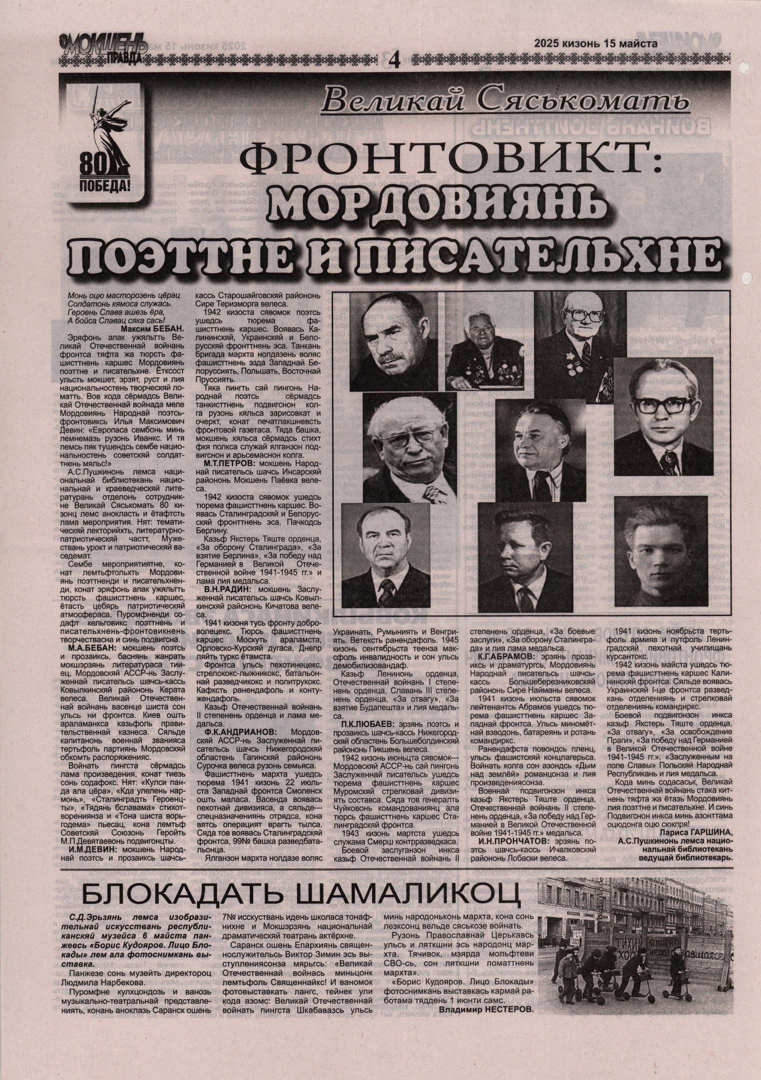 В публикации «Фронтовики: поэты и писатели Мордовии», посвященной 80-летию Великой Победы, представлен материал о литераторах Мордовии, участниках Великой Отечественной войны 1941–1945 гг.