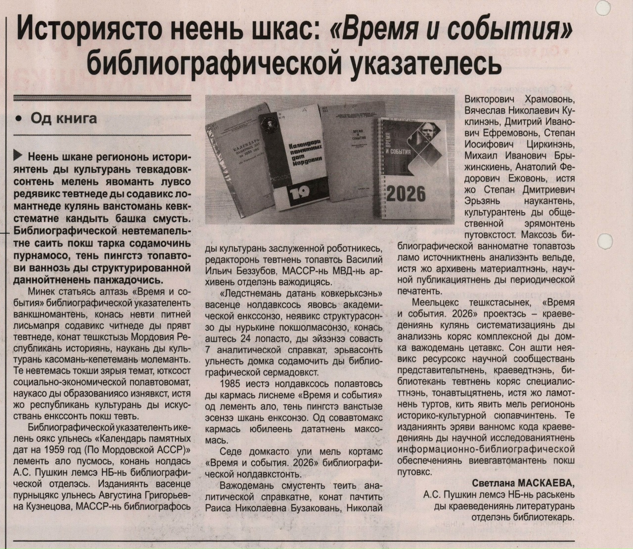 Публикация «Историясто неень шкас: “Время и события” библиографической указателесь» («От истории к современности: библиографический указатель “Время и события”») посвящена обзору библиографического указателя «Время и события. 2026», предшественником которого был «Календарь памятных дат на 1959 год. (По Мордовской АССР)», издаваемый сотрудниками библиографического отдела Национальной библиотеки Мордовии. Современное издание охватывает широкий спектр тем, включая достижения в науке и образовании, а также важные события в сфере культуры и искусства республики.