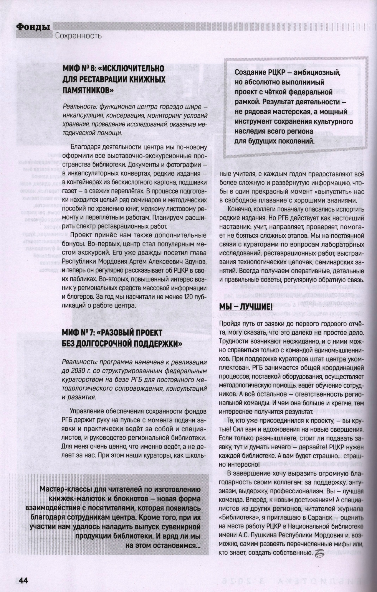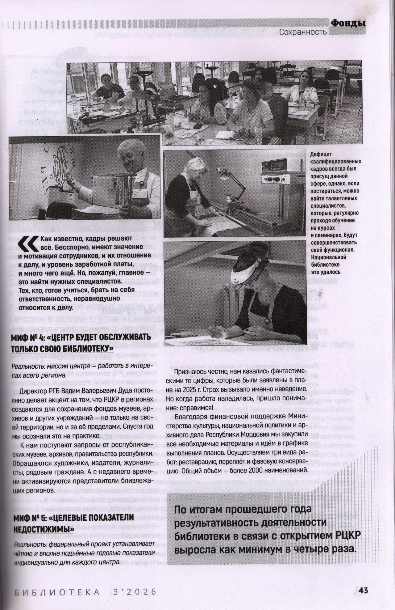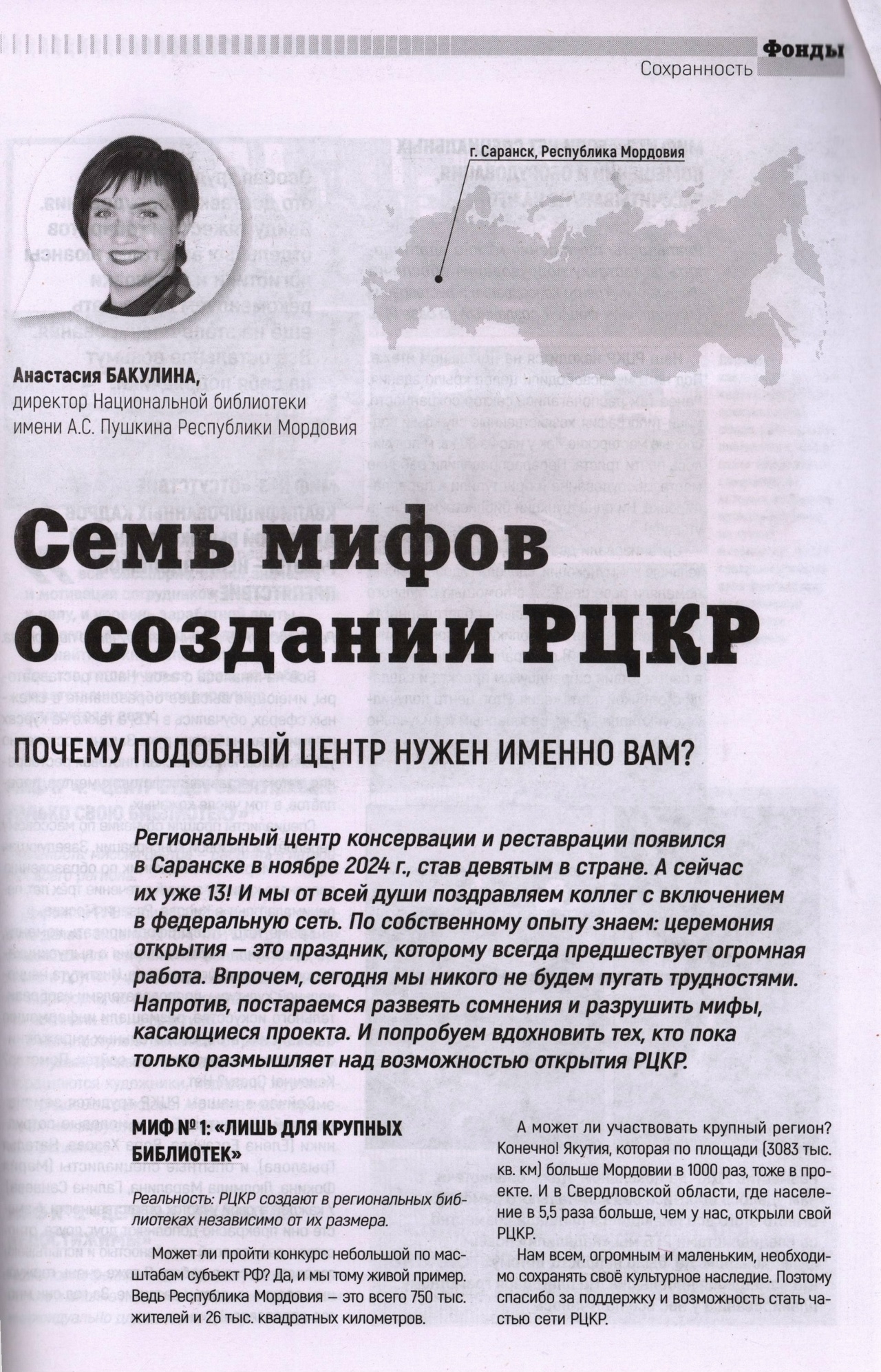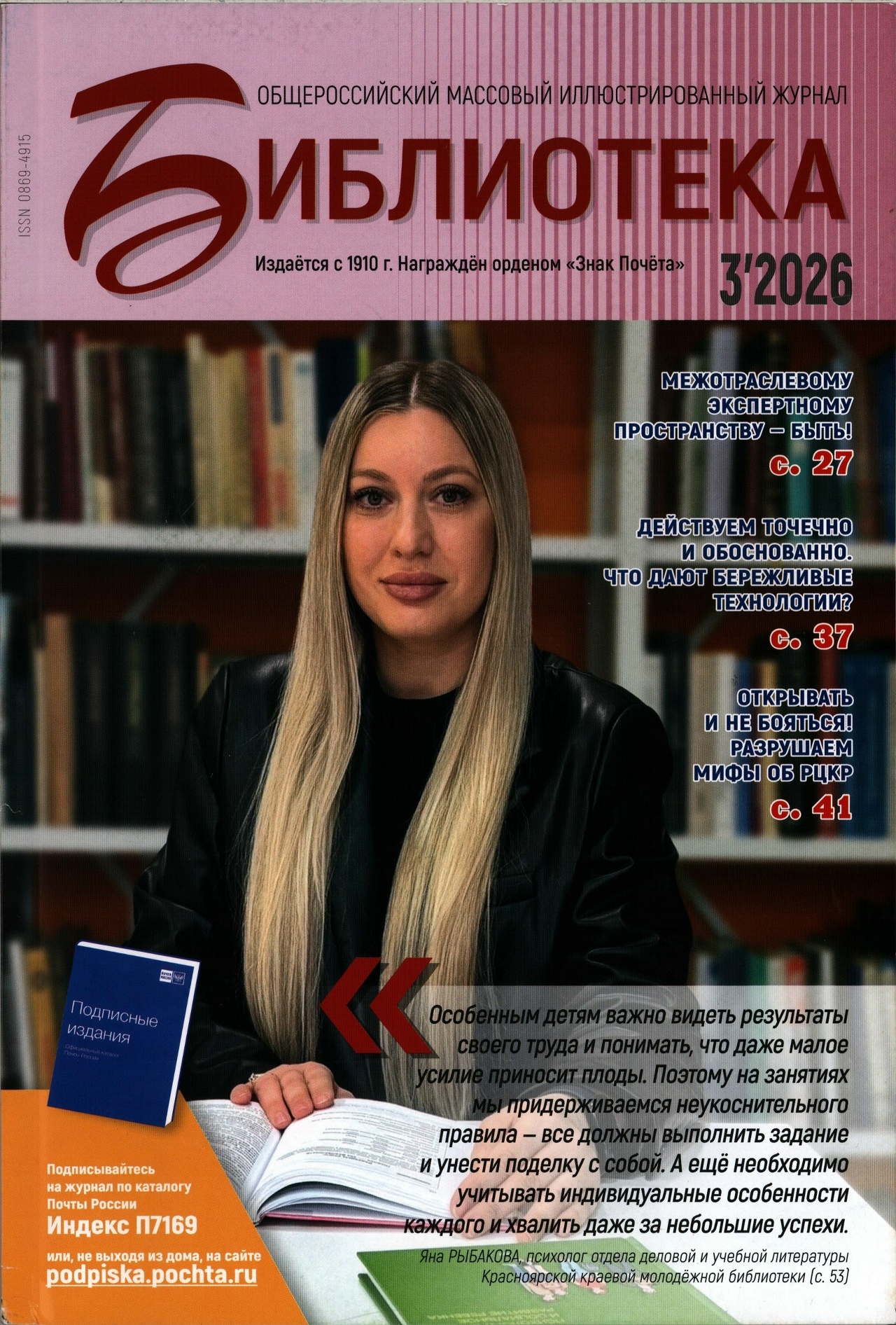 Увидел свет третий номер общероссийского массового иллюстрированного журнала «Библиотека» за 2026 год. В этом выпуске опубликована статья директора Национальной библиотеки им. А. С. Пушкина Республики Мордовия А. В. Бакулиной «Семь мифов о создании РЦКР: почему подобный центр нужен именно вам?».