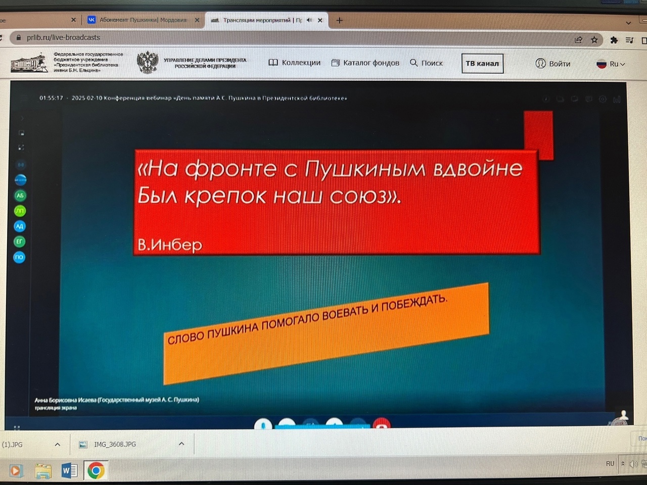 10 февраля библиотекари Пушкинки приняли участие в конференции-вебинаре «День памяти А. С. Пушкина в Президентской библиотеке» (Президентская библиотека и Всероссийский музей А. С. Пушкина) на тему «Великий Пушкин – Великая Победа!».