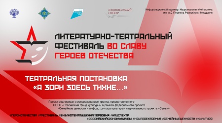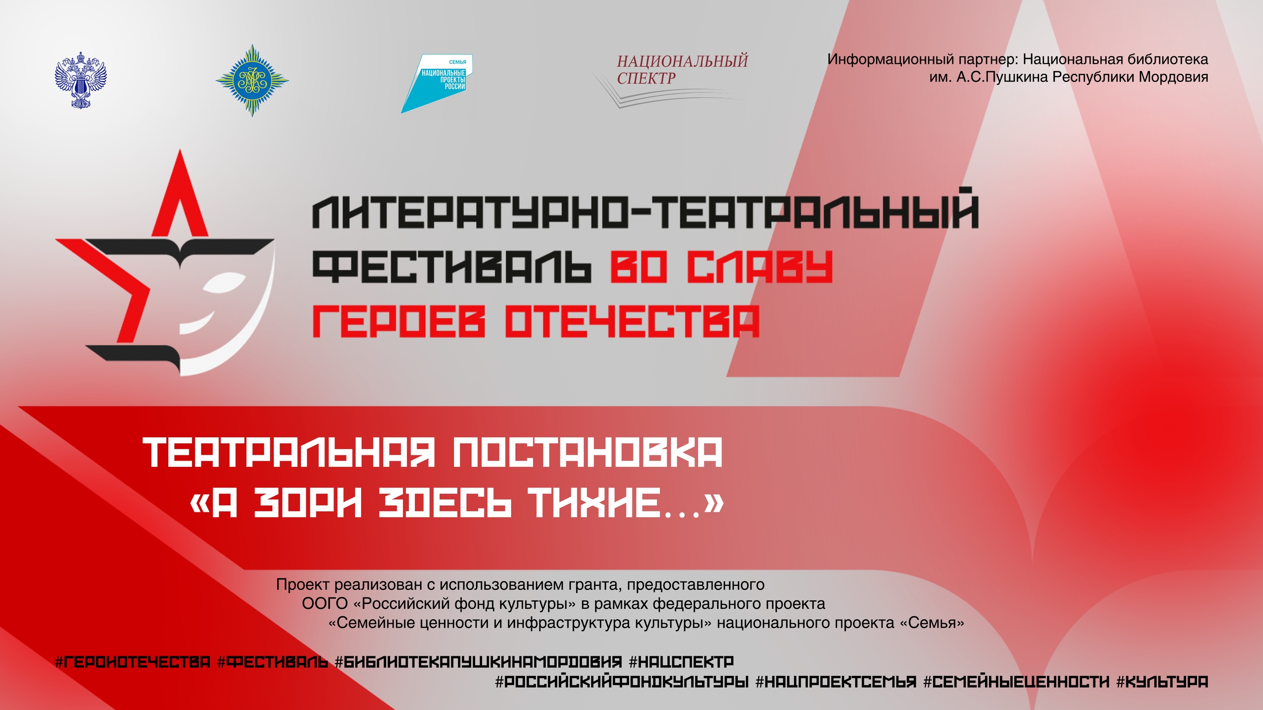 Ассоциация издателей «Некоммерческое партнерство “Национальный спектрˮ» реализует проект «Литературно-театральный фестиваль “Во славу героев Отечестваˮ» с использованием гранта, предоставленного ООГО «Российский фонд культуры» в рамках федерального проекта «Семейные ценности и инфраструктура культуры» национального проекта «Семья».