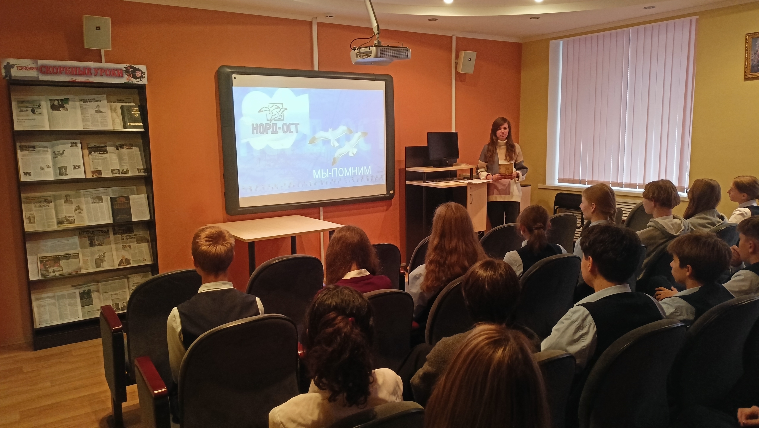 20 октября в отделе литературы по искусству для учащихся 8 класса школы № 39 в рамках учрежденного по решению региональной Антитеррористической комиссии Единого дня профилактики терроризма в Республике Мордовия состоялся час памяти, посвященный 23-летию трагических событий на Дубровке, когда террористами был захвачен Театральный центр.