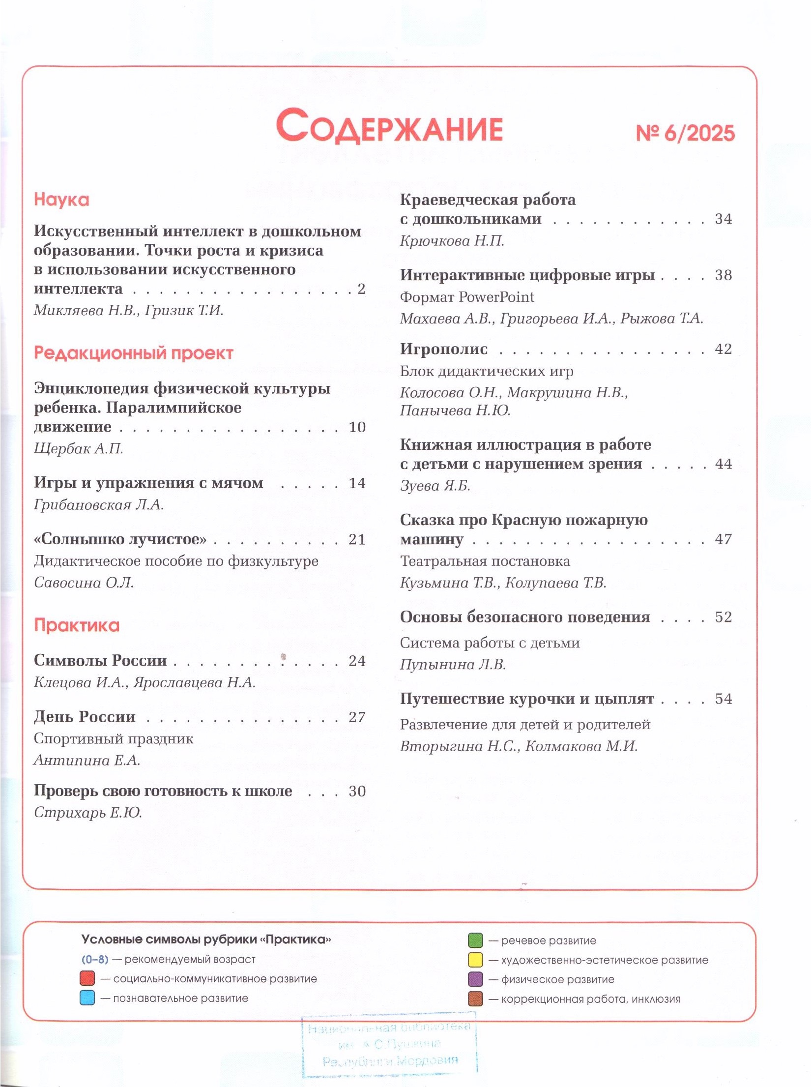 Познакомиться с рубриками журнала и аннотациями статей вы можете по ссылке: https://dovosp.ru/magazine_preschool_education/zhurnal-doshkolnoe-vospitanie-6-2025, а с журналом – в отделе периодических изданий Пушкинки: https://vk.com/periodikasaransk.