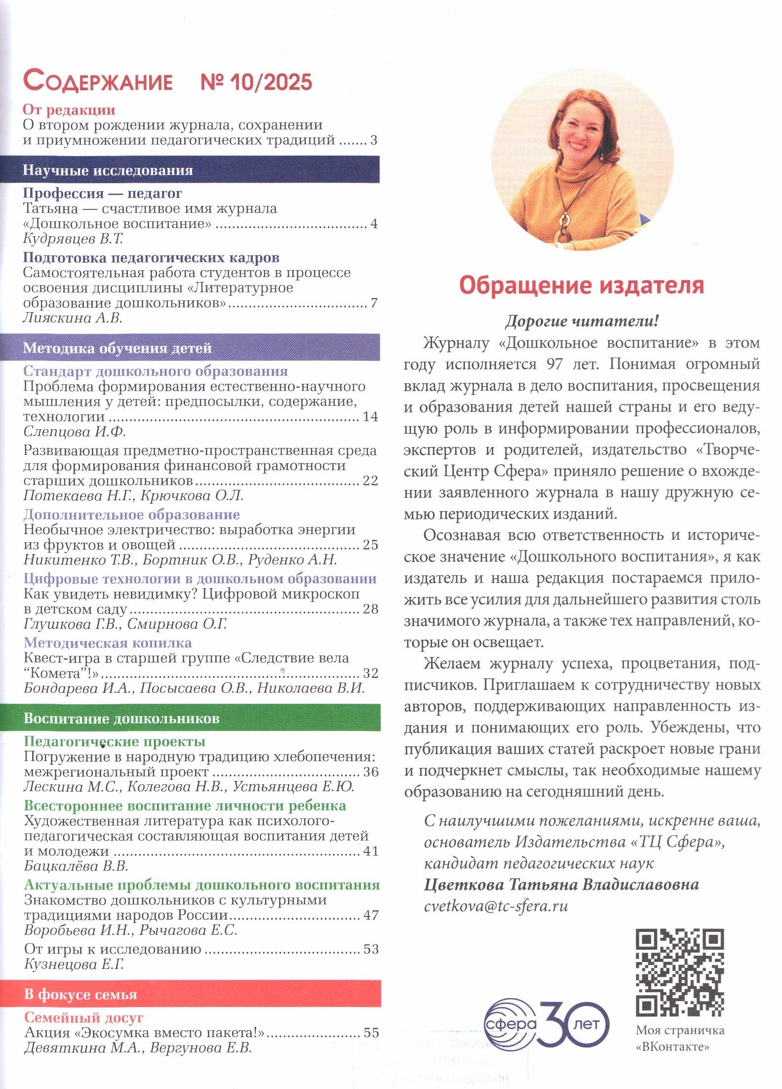 Познакомиться с рубриками журнала и аннотациями статей вы можете по ссылке: https://dovosp.ru/magazine_preschool_education/zhurnal-doshkolnoe-vospitanie-10-2025, а с журналом – в отделе периодических изданий Пушкинки: https://vk.com/periodikasaransk.