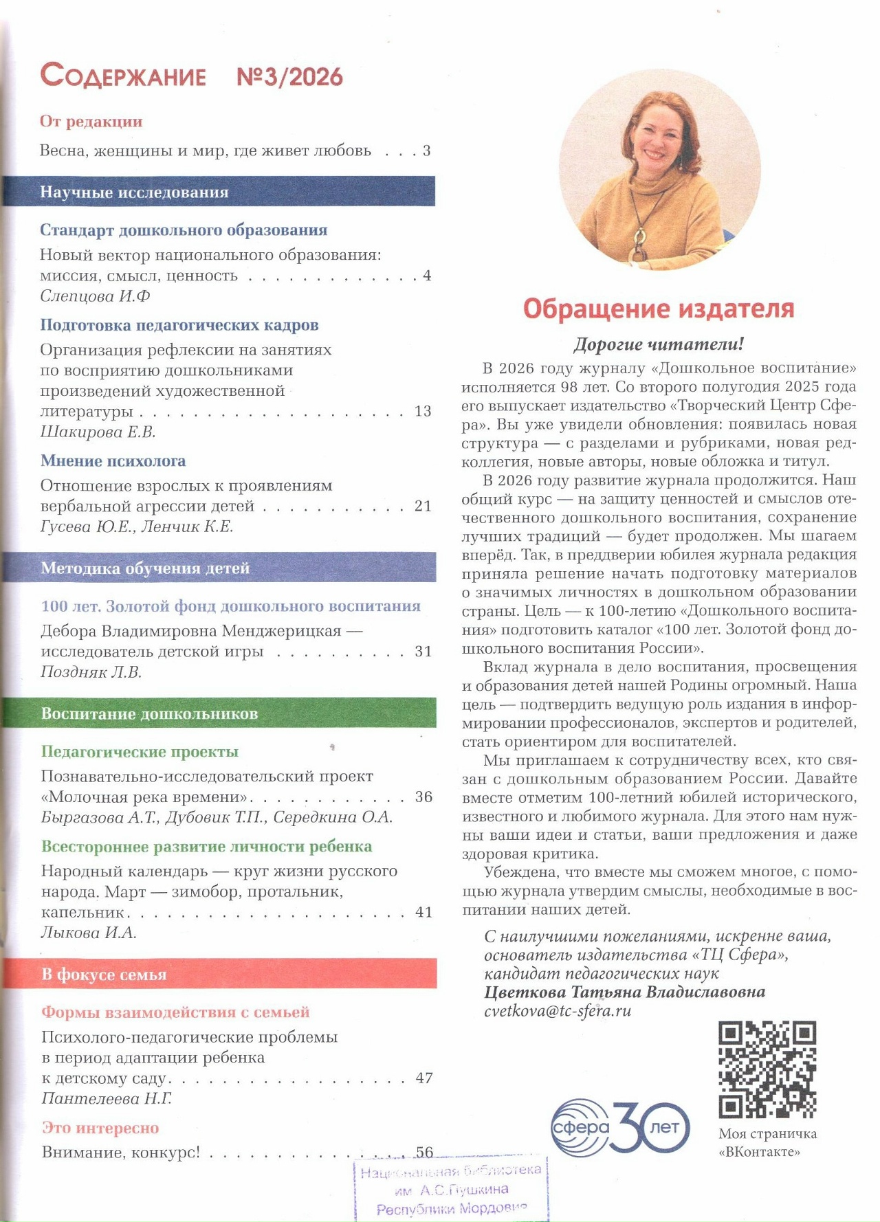 Познакомиться с рубриками журнала и аннотациями статей вы можете по ссылке: https://dovosp.ru/magazine_preschool_education/zhurnal-doshkolnoe-vospitanie-3-2026, а с журналом – в отделе периодических изданий Пушкинки: https://vk.com/periodikasaransk.