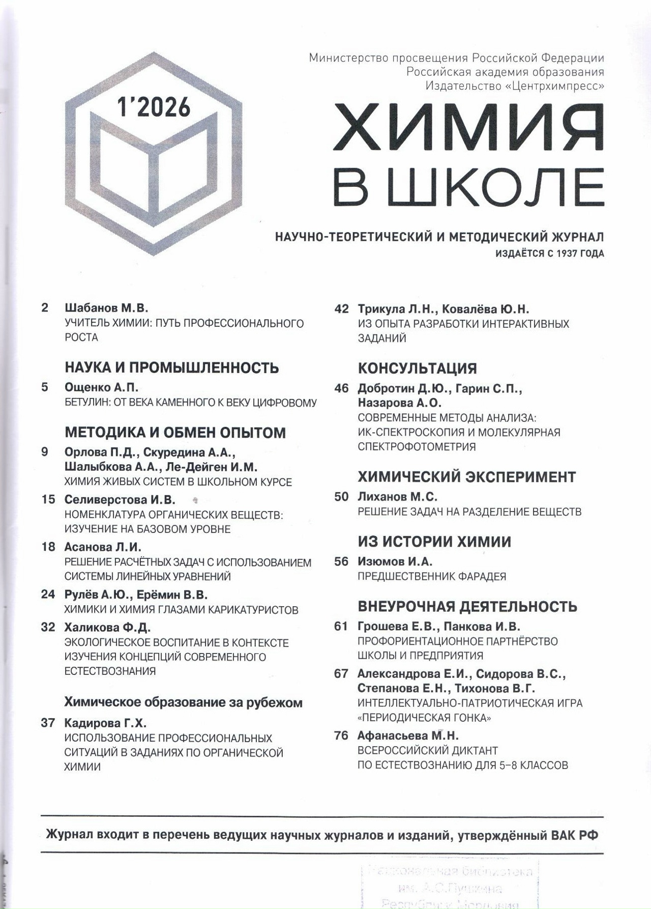 Журнал «Химия в школе» предназначен для учителей химии средних общеобразовательных учреждений, преподавателей химии средних специальных и высших учебных заведений, соискателей ученых степеней кандидата и доктора педагогических наук. В нём публикуются материалы, способствующие повышению квалификации учителей, актуализации их научной и методической подготовки.