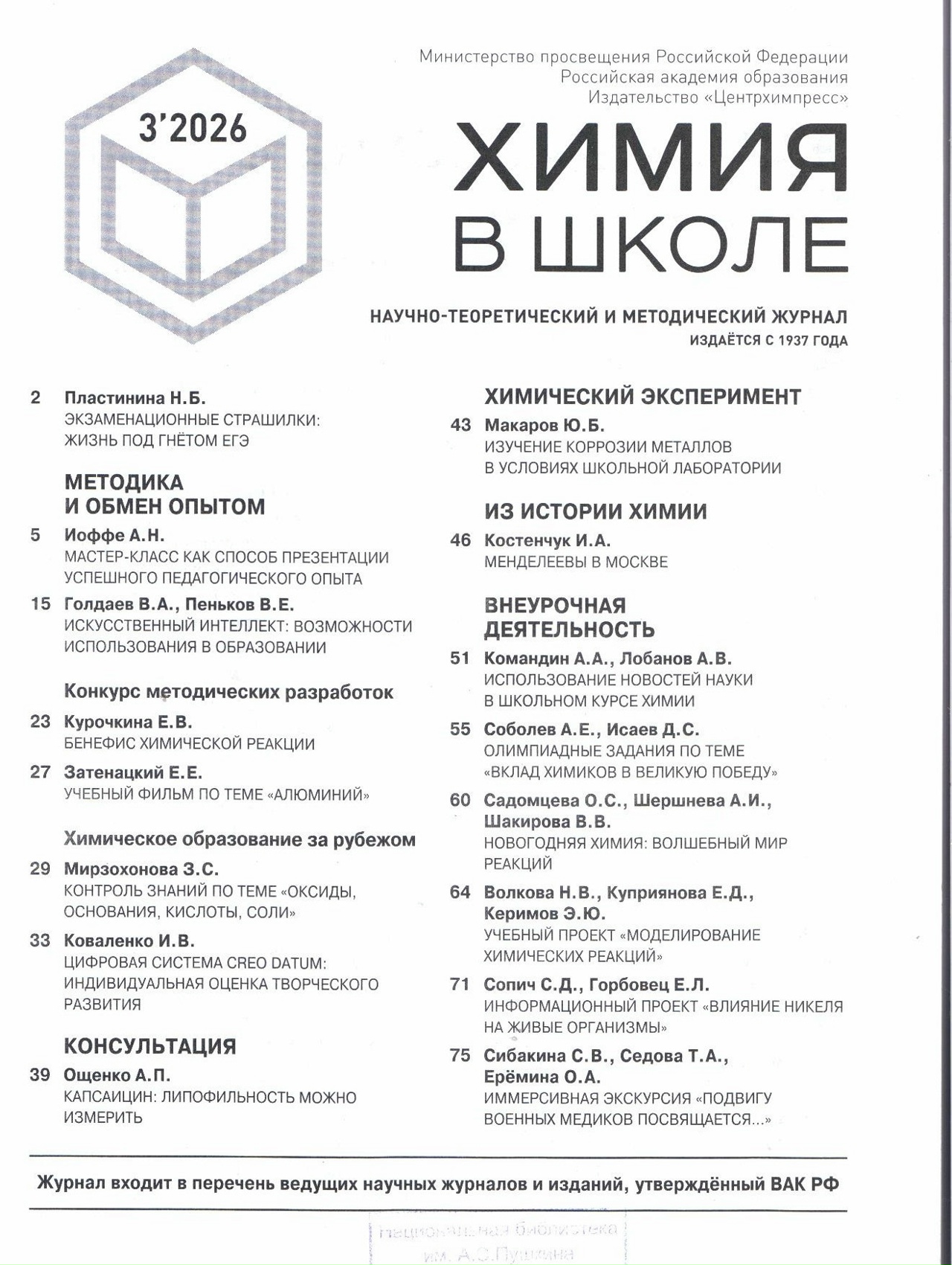 Познакомиться с рубриками журнала и аннотациями статей можно по ссылке: https://hvsh.ru/2026-3/, а с журналом – в отделе периодических изданий Пушкинки: https://vk.com/periodikasaransk.