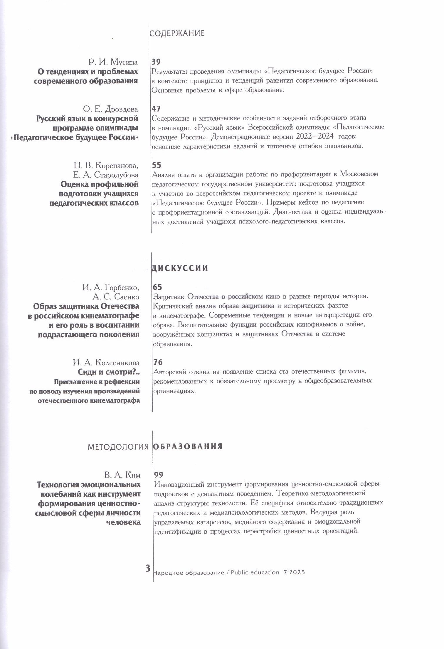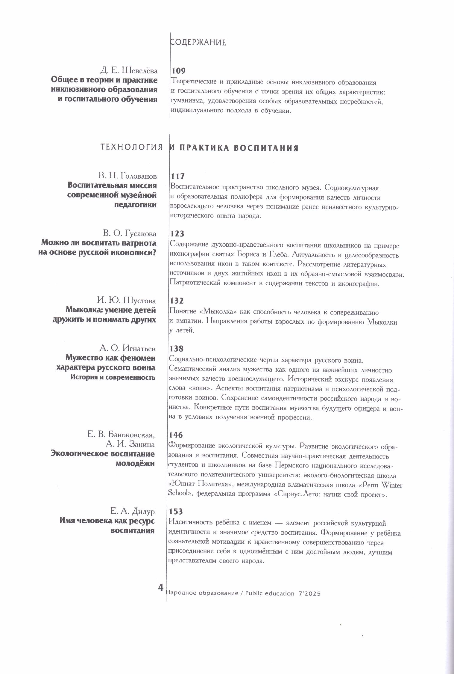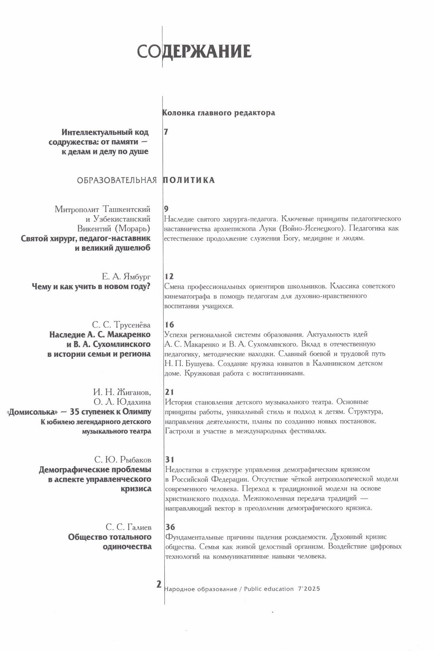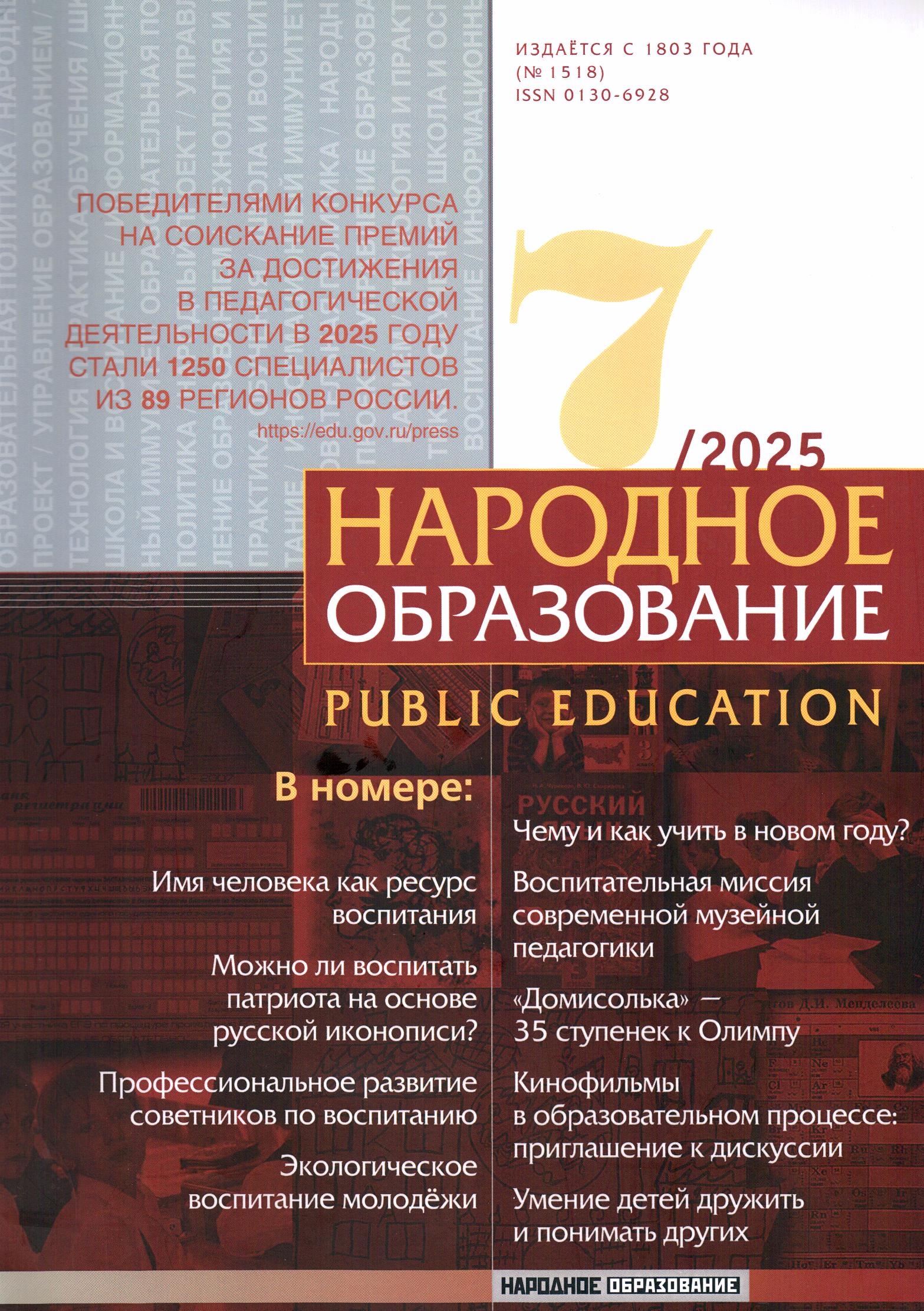 В седьмом номере журнала «Народное образование» за 2025 год представлены следующие рубрики: «Образовательная политика», «Дискуссии», «Методология образования», «Технология и практика воспитания», «Повышение квалификации», «Технология и практика обучения».