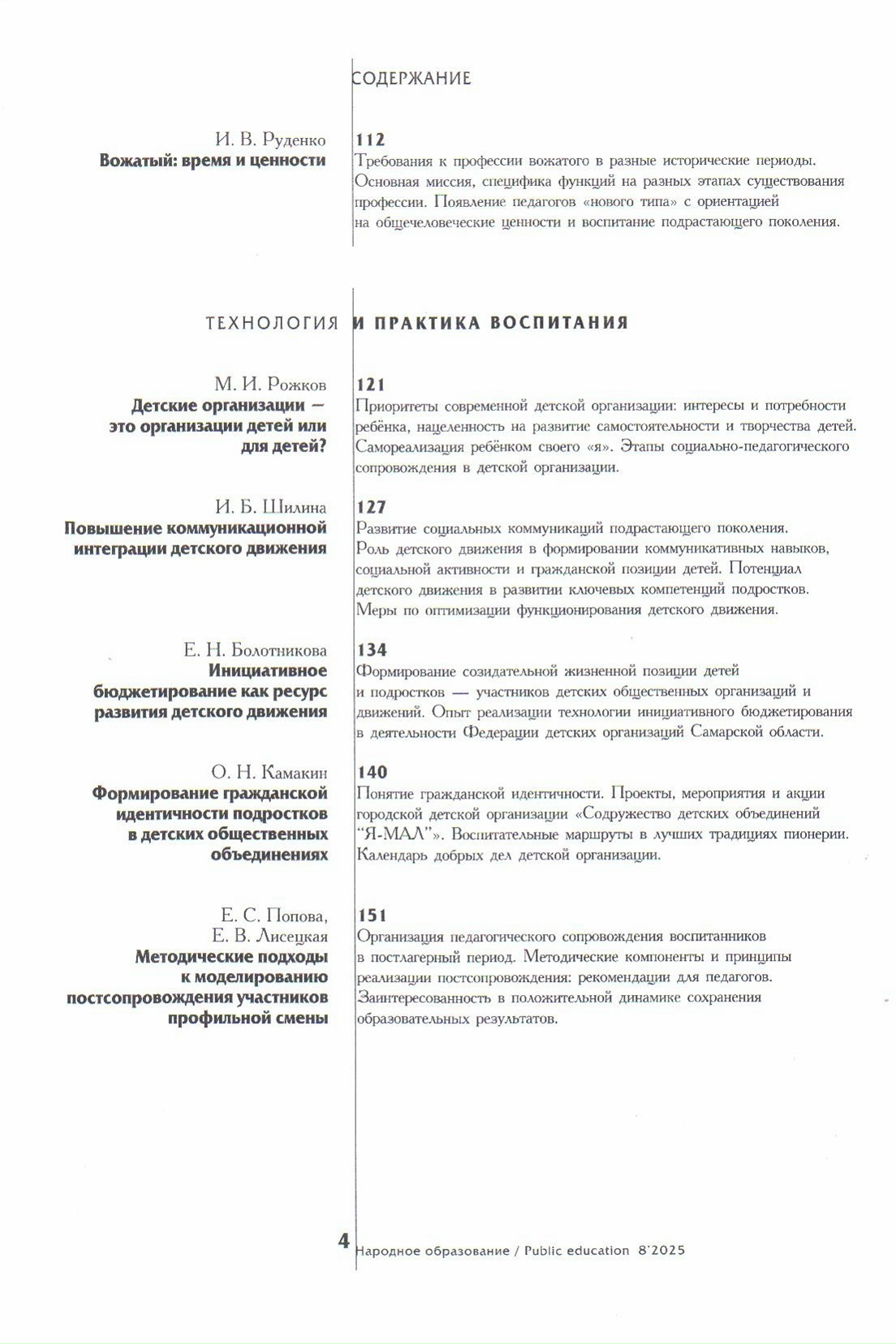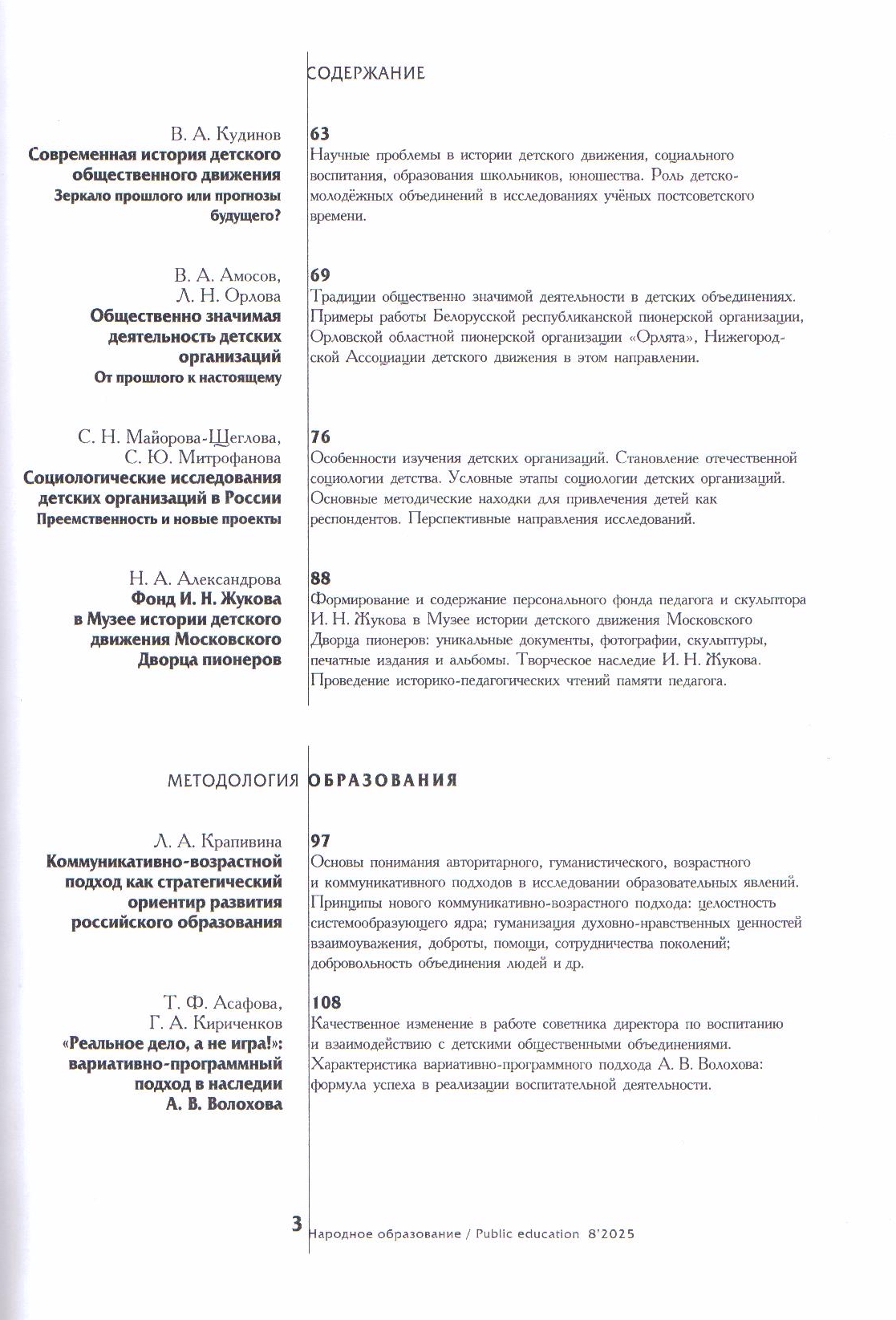 В восьмом номере журнала «Народное образование» за 2025 год представлены рубрики: «Образовательная политика», «Методология образования», «Технология и практика воспитания».