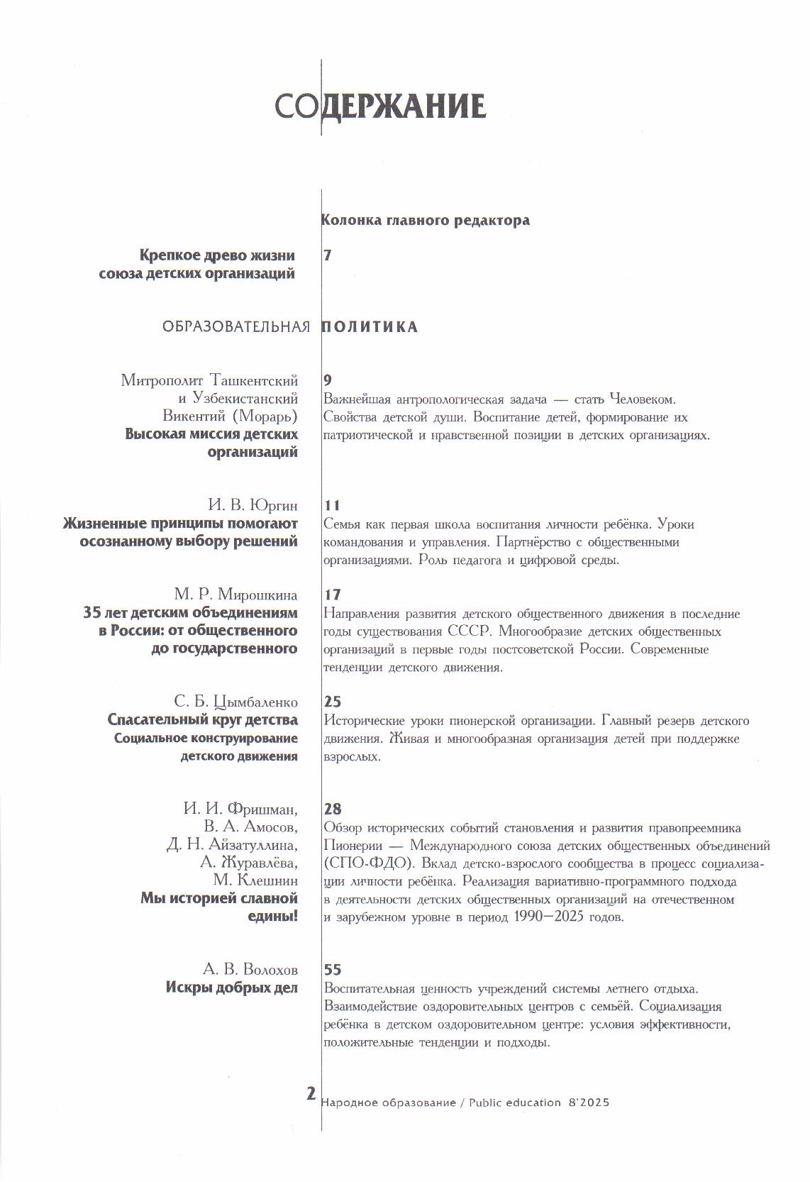 Рубрика «Образовательная политика» знакомит с материалом В. А. Кудинова «Современная история детского общественного движения. Зеркало прошлого или прогнозы будущего?». Автор рассматривает с научной точки зрения проблемы в области истории детского движения, социального воспитания, образования школьников и юношества, анализирует роль детско-молодежных объединений.