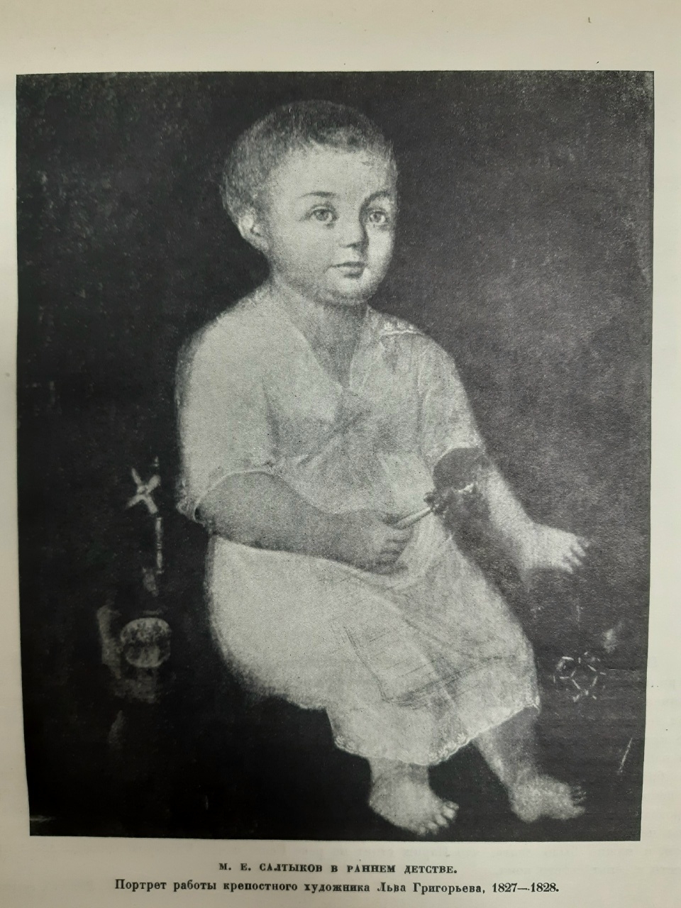 Самый ранний портрет М. Е. Салтыкова-Щедрина принадлежит кисти крепостного живописца Льва Григорьева. Это один из тех «домашних» детских портретов, которые составляли непременную принадлежность каждого зажиточного дворянского дома. Существует и другой ранний портрет Салтыкова, исполненный акварелью, в формате почти миниатюры (на обороте имеется надпись, сделанная отцом будущего писателя).