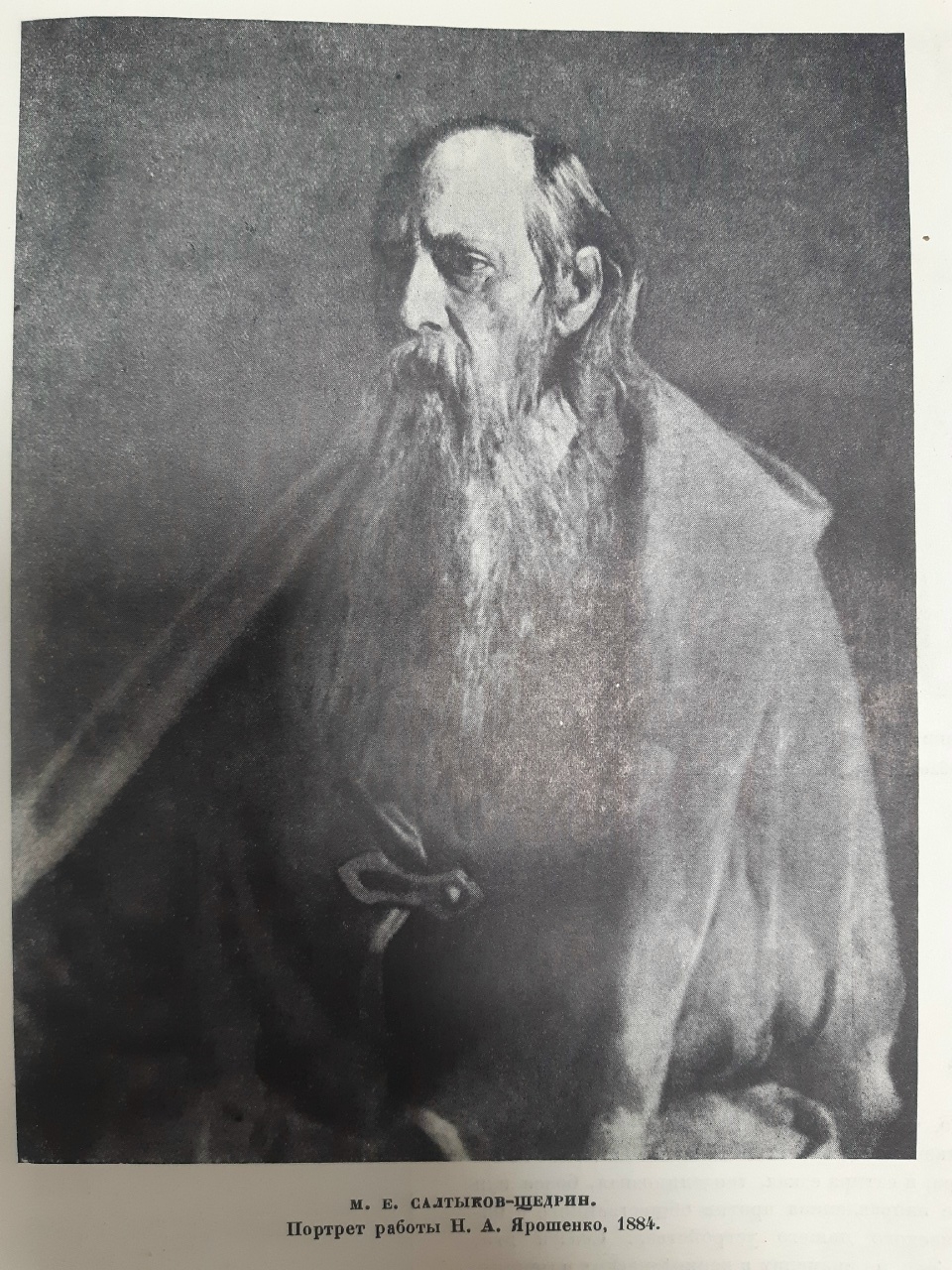 Следующий замечательный портрет писателя принадлежит кисти Н. А. Ярошенко. Можно сказать, что Ярошенко писал Салтыкова в один из последних годов его жизни; это подтверждается сходством ярошенковского портрета с фотографиями последних лет. Местонахождение оригинала ныне неизвестно.