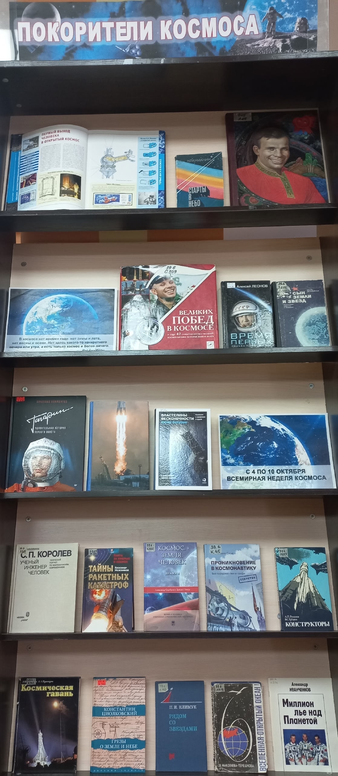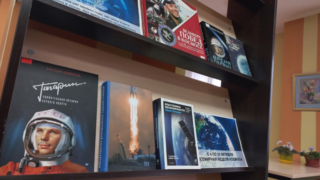 Также в течение месяца в отделе (503 к.) действует книжная выставка «Покорители космоса», представлена литература о важных вехах в истории космонавтики и людях, вершивших эту историю в нашей стане и за её пределами.