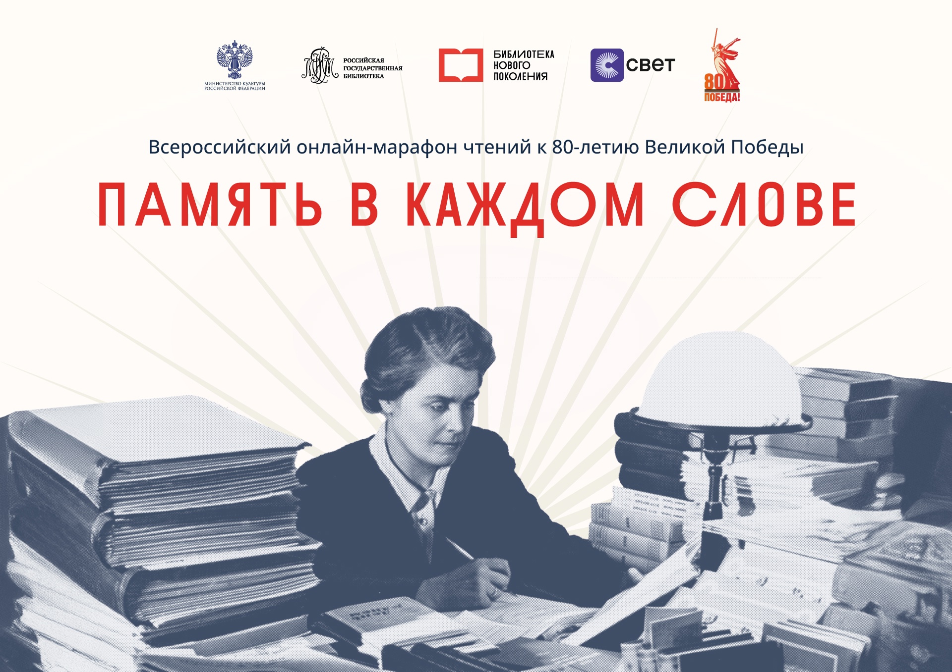 К 80-летию празднования Великой Победы Проектный офис Российской государственной библиотеки совместно с редакцией мобильного приложения Национальной электронной библиотеки «Свет» организовали Всероссийский онлайн-марафон чтений к 80-летию Великой Победы «Память в каждом слове». Задачами акции, приуроченной также к празднованию Года защитника Отечества, стало знакомство широкой аудитории с литературным наследием, посвященным военному времени, и духовно-патриотическое воспитание.