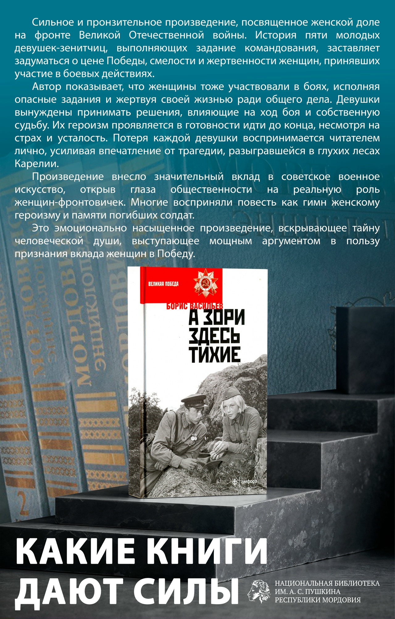 Сегодня мы вспоминаем повесть Бориса Васильева «А зори здесь тихие…» о судьбах пяти самоотверженных девушек-зенитчиц и их командира во время Великой Отечественной войны.