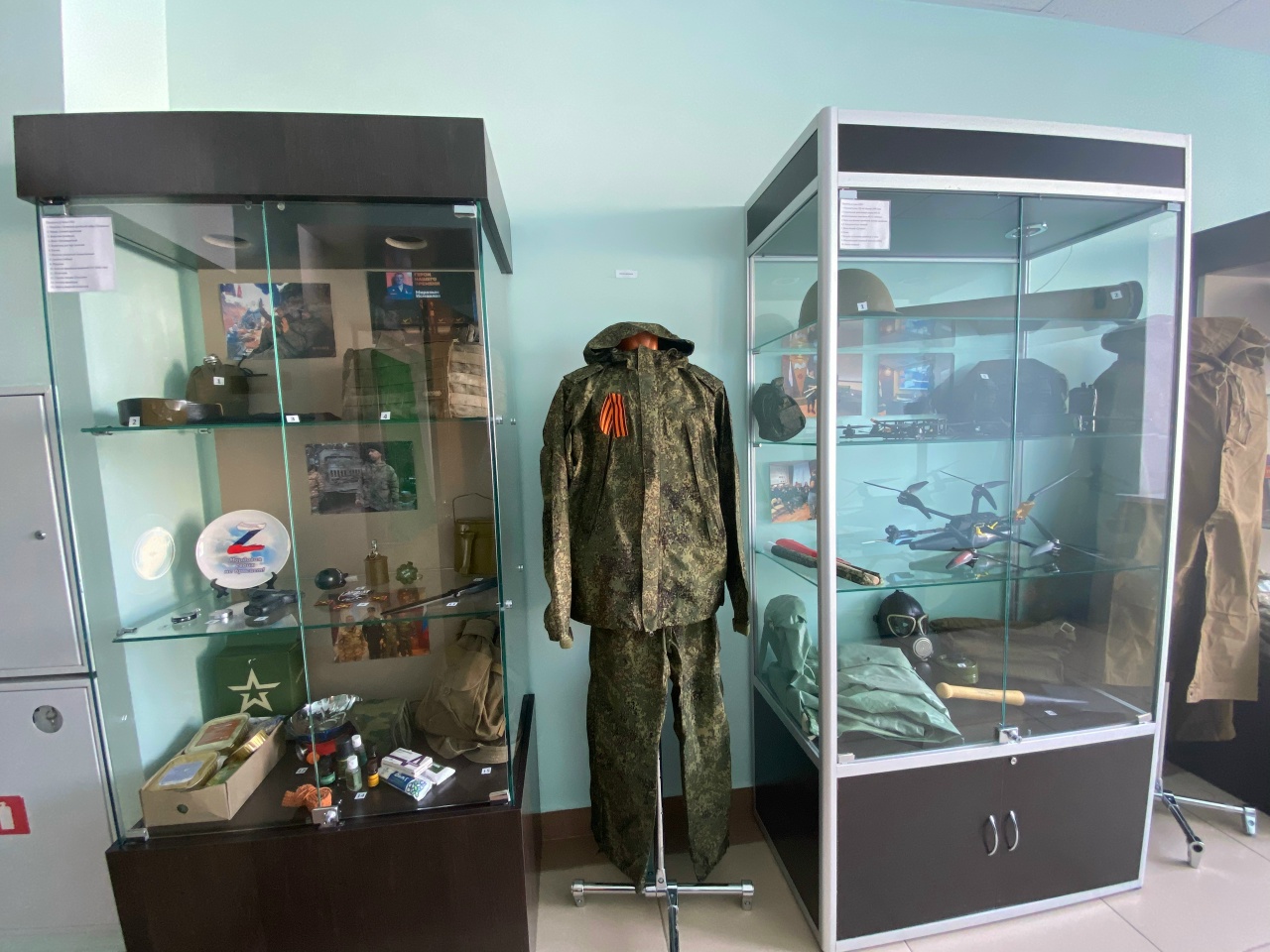 В фойе 3 этажа 1 корпуса начала работу выставка «Стойкость. Верность. Отвага». Здесь представлены личные вещи и боевые атрибуты из зоны проведения специальной военной операции, каждый из которых несет свою уникальную историю.